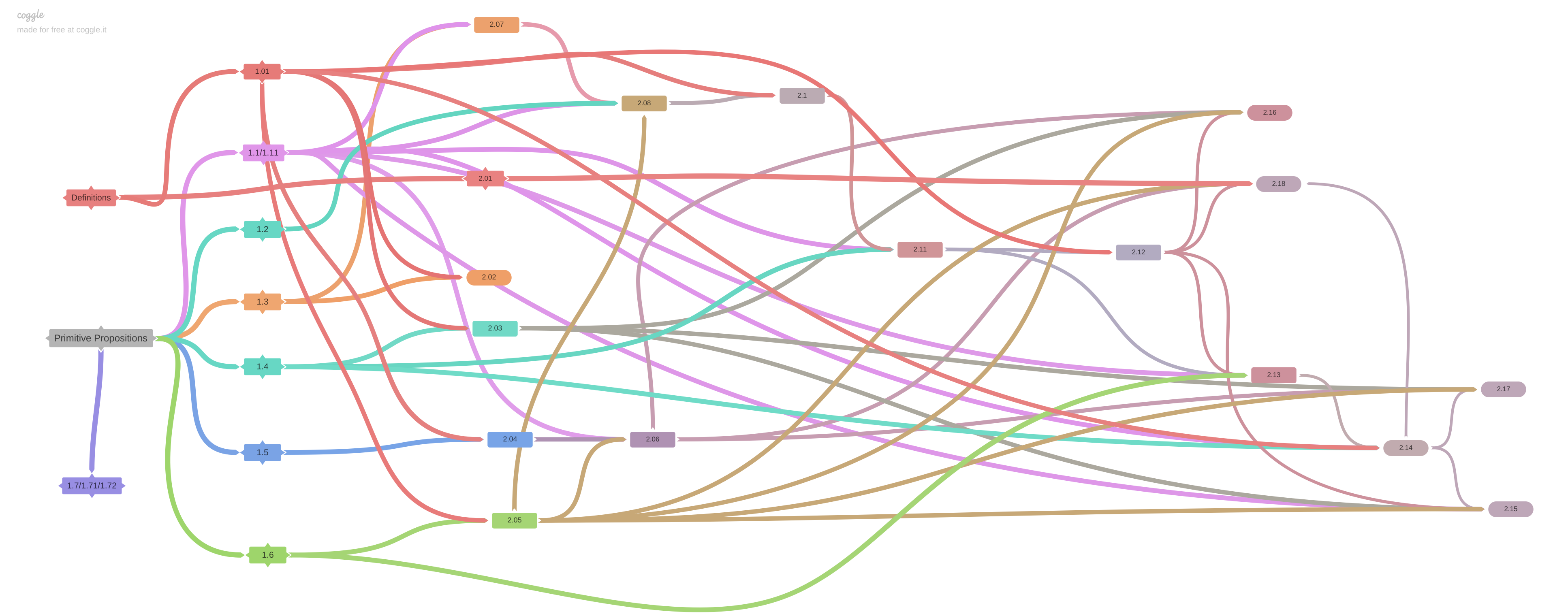 The Principia Rewrite project also has historical interest. It helps us rethink Principia's reputation as a "step backwards" from Gottlob Frege's Grundgesetze. This sort of evaluation of Principia was defended by notable logicians like Kurt Gödel, who especially complained about its proof sketches and syntax. The Principia Rewrite is revealing, firstly, that the proof sketches are actually quite methodical, so that what is omitted are almost always simple applications of commutativity or association. So this project gives us insight into the logical structure of Principia, as might be visualized using a subway-style map. Below is a sample of from the propositional logic proofs in *2.